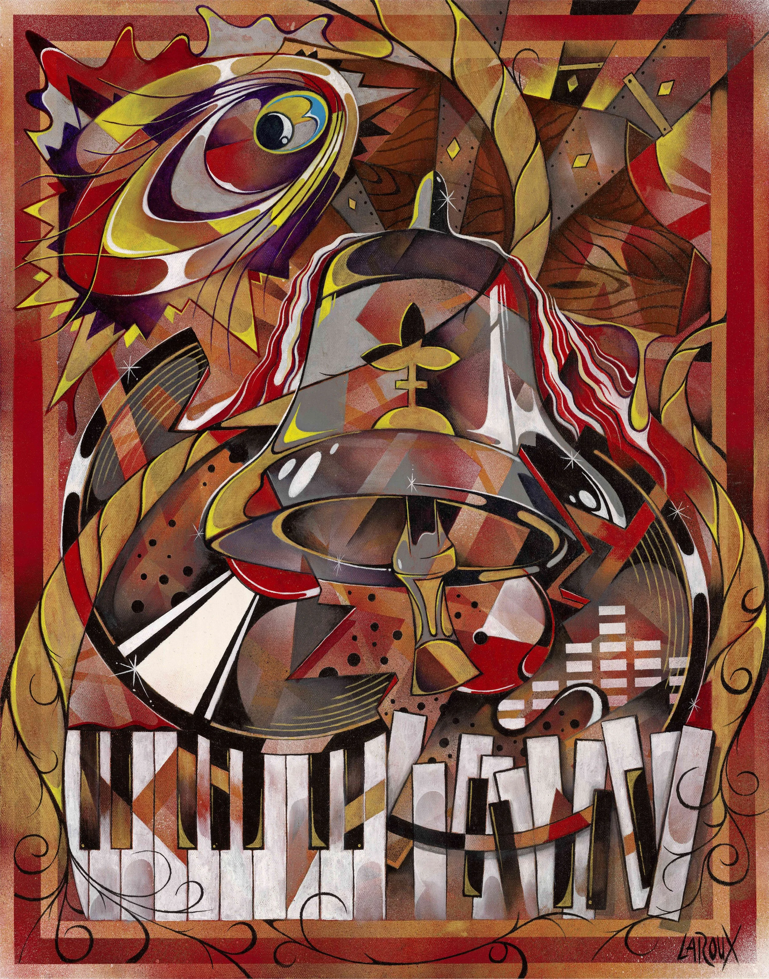 The piece was initially inspired by Laroux’s exhibition at the Polish Consulate in New York City in April 2025, where his cousin, a pianist specializing in Chopin, performed live. Zygmunt Bell was exhibited during this performance alongside Laroux’s celebrated Chopin portrait, creating a dialogue between the live music, visual art, and cultural heritage. In the work, piano keys are integrated, linking the sonorous music of Chopin to the resonant vibrations of the Zygmunt Bell. These vibrations shatter a vinyl record and the piano keys themselves, symbolizing the force and reverberation of sound—a motif Laroux continues to explore throughout his series. Equalizer bars rise from the keys, visualizing the music created by the bell.
