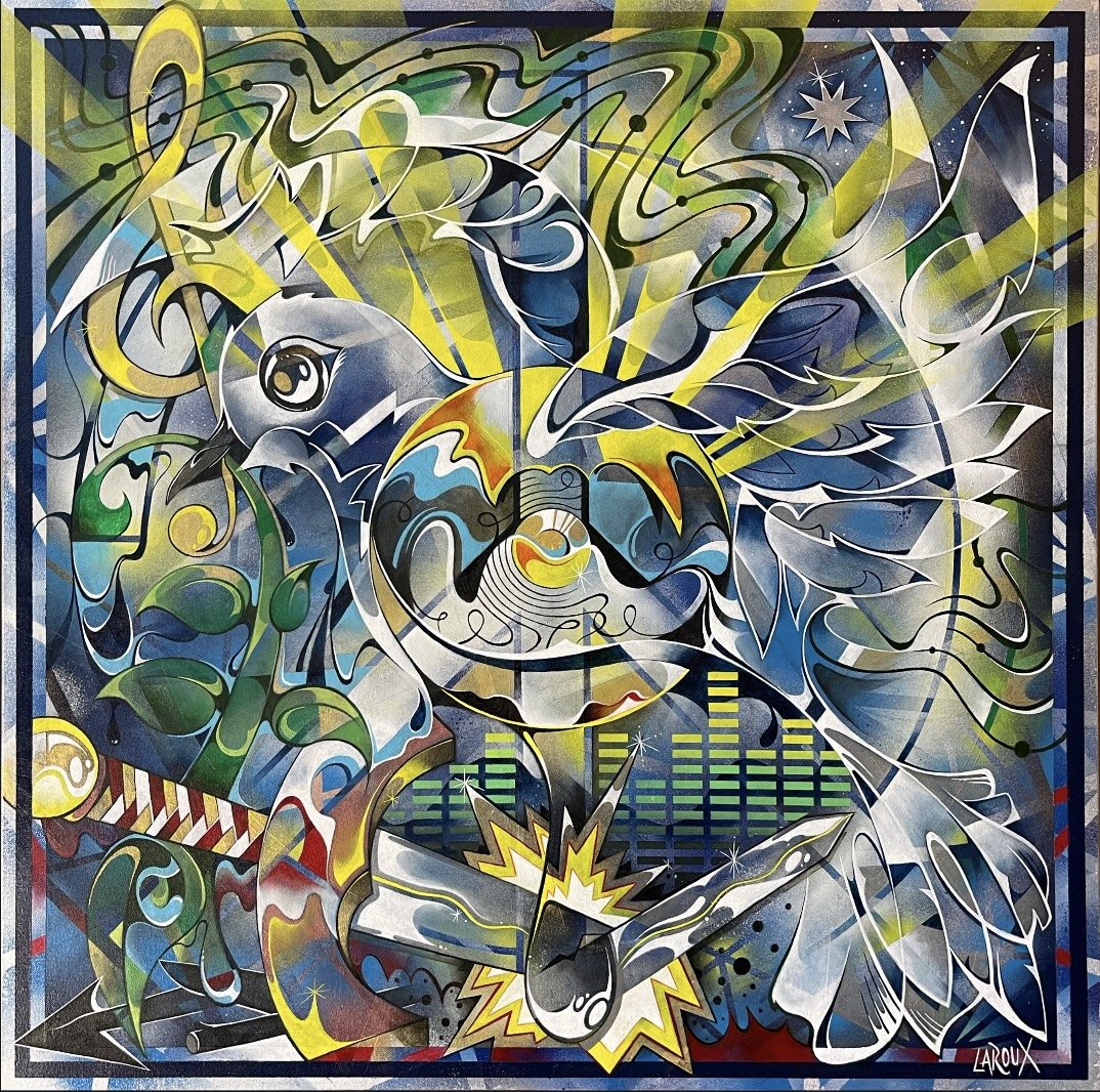 As global tensions rise and violence dominates headlines, LAROUX’s peace painting emerges as a powerful reminder of our collective need for harmony. Inspired by Picasso’s Colombe en soleil, where the dove stands as a timeless symbol of peace, LAROUX reinterprets the motif with urgent, contemporary relevance. At the heart of the artwork, the iconic peace symbol anchors the composition, surrounded by flowing musical notes and a vinyl record that appears to melt over a sword—transforming an object of war into a relic of the past. Behind the vinyl's melting drip, equalizer bars pulse like the heartbeat of peace itself, amplifying the message that sound—like love and understanding—has the power to reshape reality.The sword, once a symbol of conflict, is consumed not by fire, but by music. The vinyl’s molten rhythm dissolves violence, while the equalizer bars evoke the presence of an unseen song—a universal language that speaks toour shared humanity. LAROUX’s artwork does more than depict peace—it insists on it.